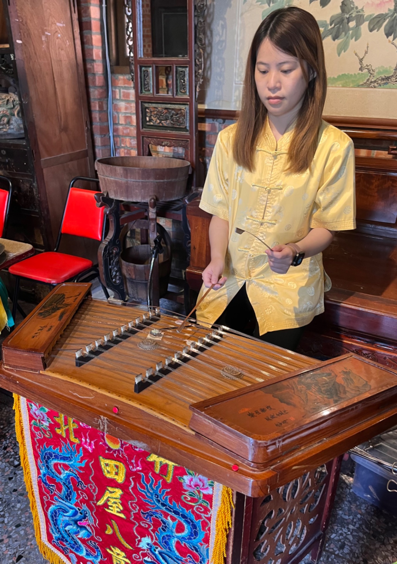 揚琴以擊弦發聲,音箱以木製成,呈扁平梯形,上有144條弦,雙手持「琴竹」擊奏。